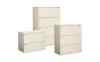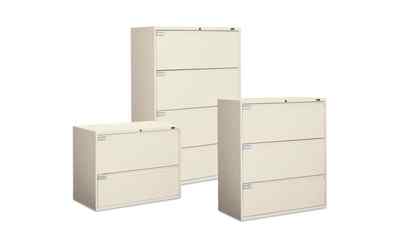 Global lateral files can store three ring binders, computer printout binders and file folders in the oversized “B” drawers in every cabinet. Interlock system prevents tipping by allowing only one drawer to open at a time. Removable cam locks are standard. 30"w, 36"w and 42"w fixed or receding front lateral file configurations available. Looped full pull design. 2 DRAWER LATERAL 9136P-2F1H (Fixed) 36w x 18d x 27 1/8h - LB: 118 - FT³: 12 Shown left in Bone (F29) 3 DRAWER LATERAL 9136P-3F1H (Fixed) 36w x 18d x 27 1/8h - LB: 168 - FT³: 18 Shown right in Bone (F29) 4 DRAWER LATERAL 9136P-4F1H (Fixed) 36w x 18d x 54h - LB: 214 - FT³: 24 Shown center in Bone (F29)