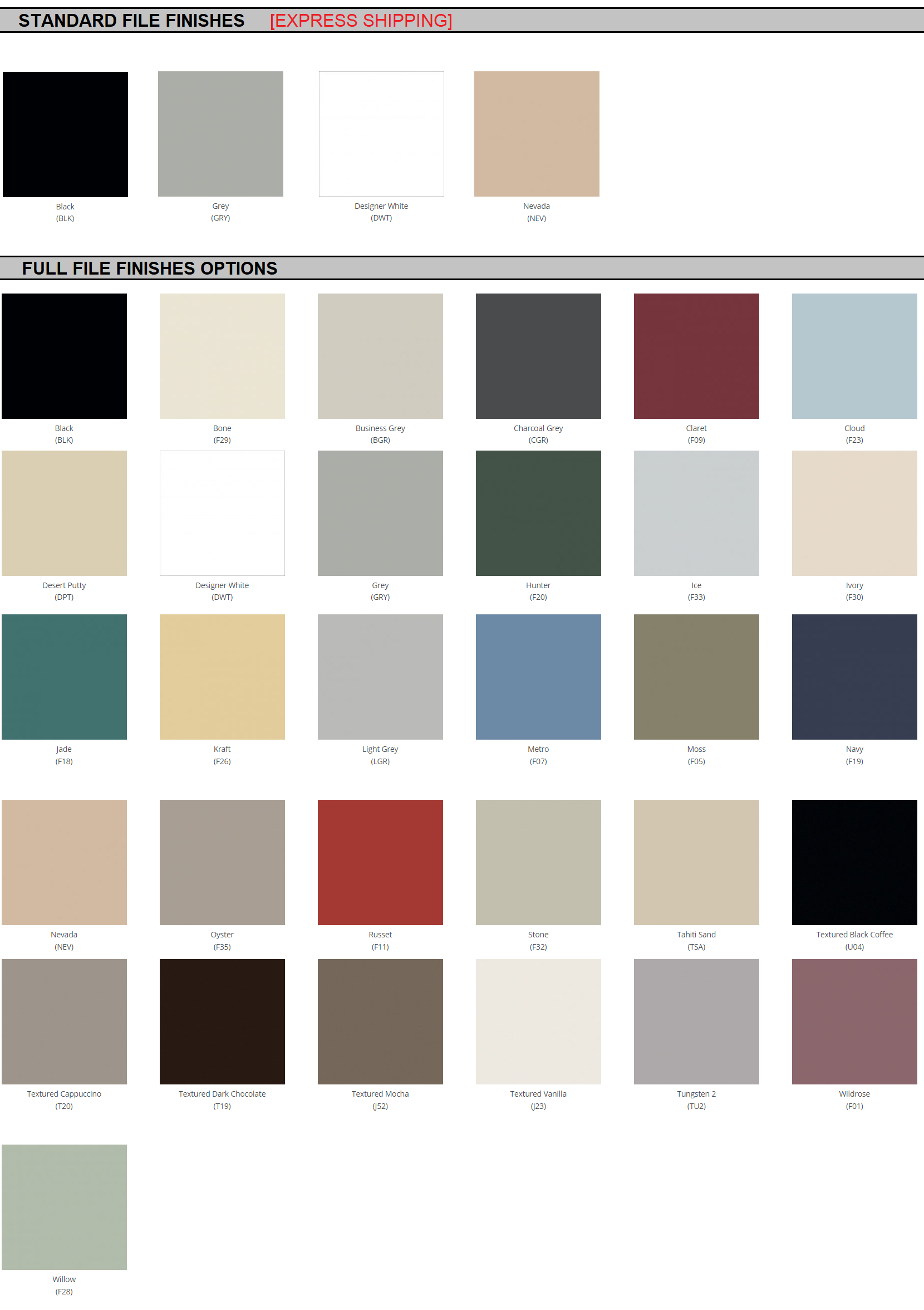 - All fixed front lateral file drawers ("B" & "L") hold letter, legal and A4 metric file sizes with side-to-side hanging file bars provided.