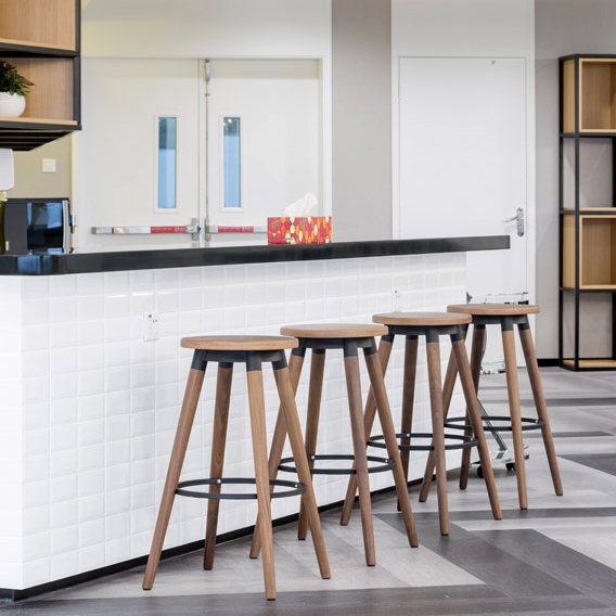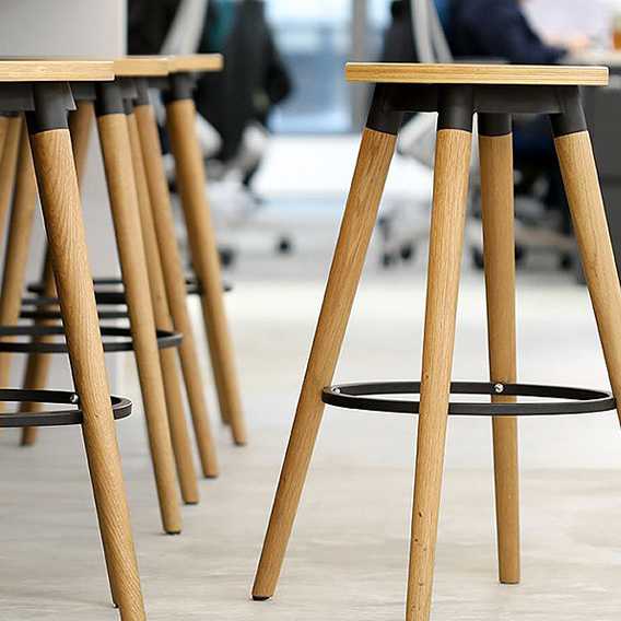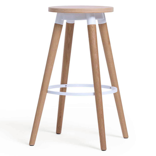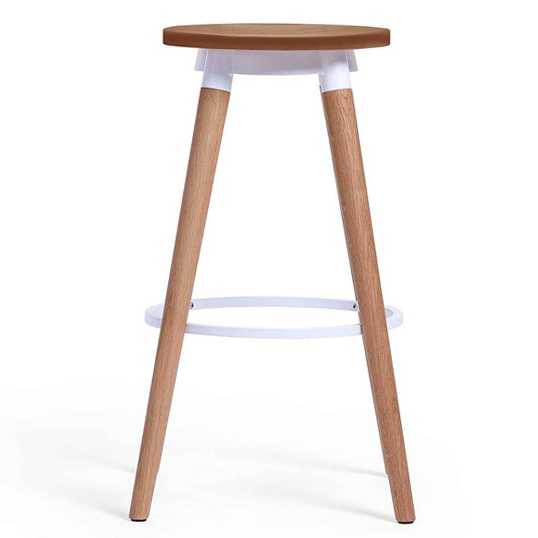 Copine mid-century modern backless bar stools are perfect for meeting/collaborative, cafe, and break room areas. They are available with a wooden or an upholstered leather/fabric seat, and are finished in your choice of 21 wood veneers contrasted with 19 epoxy metal finishes.