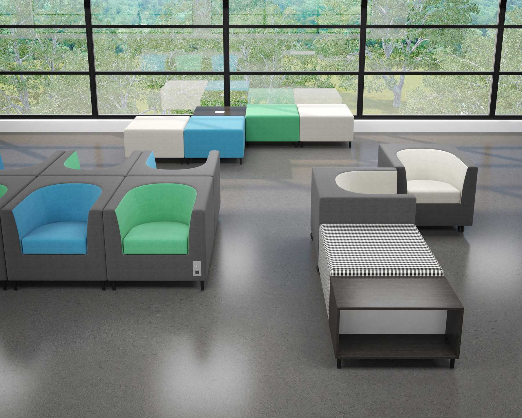 Cuadro is the building block for your next design. Use it individually or shape lounge space in three dimensions with 30” geometric cube chairs that are square for design, yet round for comfort, square ottomans and table for linear designs as well as angled tables for non-linear layout possibilities.