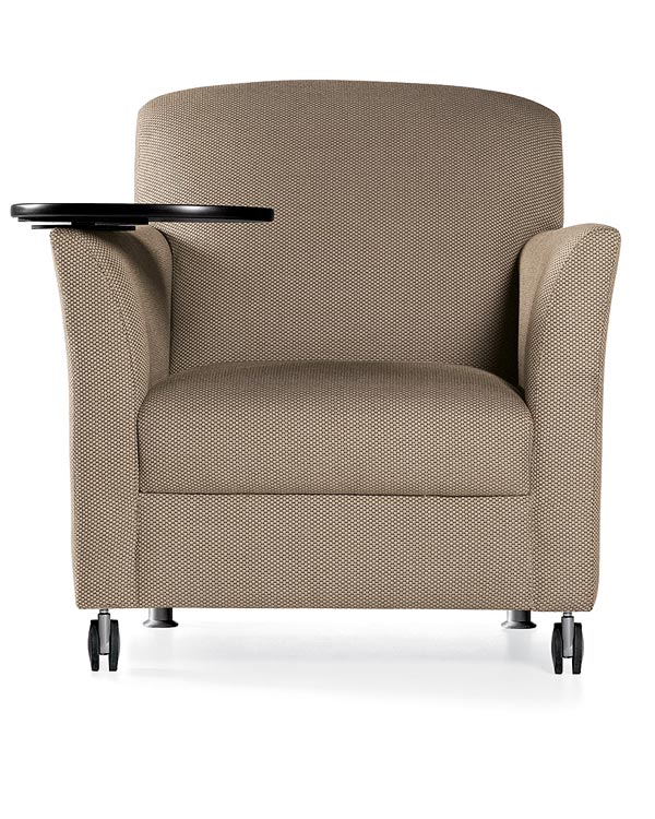 This lounge and reception chair provides supportive comfort with a crisp, clean, contemporary aesthetic. Options include tablet arm (with or without). A glide/caster option is also available with a chrome pull handle on the exterior of the backrest for easy movemen
