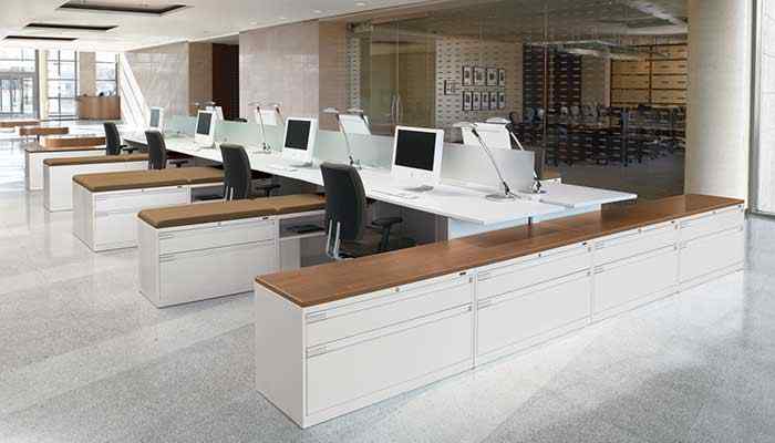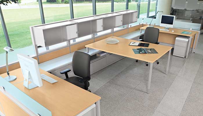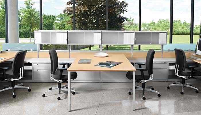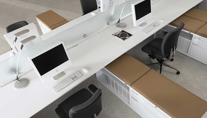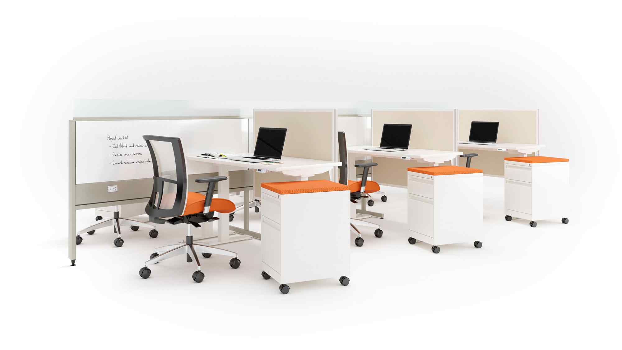 A range of ergonomic worksurfaces/desks and practical storage and filing options enable cost-effective planning. Evolve worksurfaces also provide ‘scoops’ to pass wires from more permanent desktop equipment to the primary base feed. User-controlled elements like height adjustable sit-to-stand surfaces also support healthy spaces for workers.