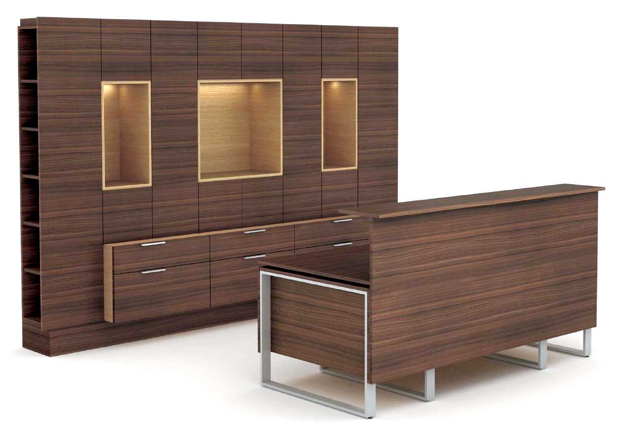 Today's office is less formal, more functional. Foundations series reception casegood components include modular desks with transaction tops, credenzas, and wall storage units punctuated by niches set into the vertical plane of the unit. Evoking modern architectural facades, the striking design also allows for a higher level of flexibility in the office space. Personal items or work tools can be stored in the niches, desks, and storage components that combine to suit individual needs.