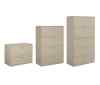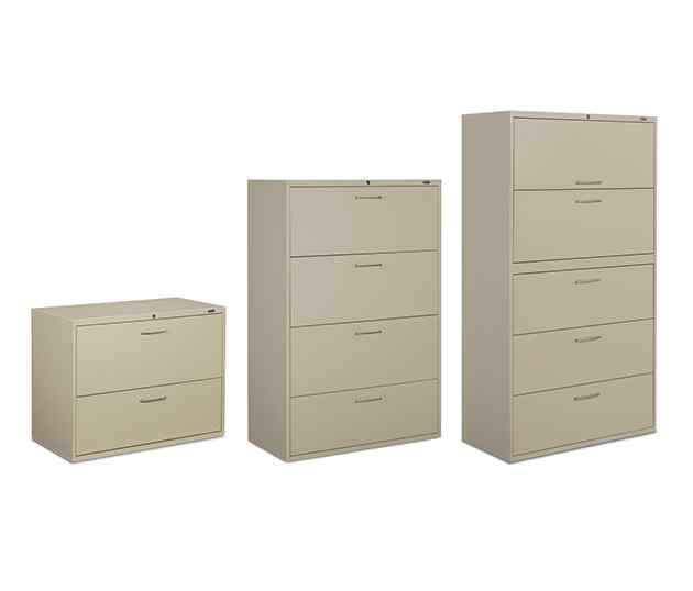 Slimline satin aluminum handles are a key design element to the series. All fixed front lateral file drawers (“B” & “L”) hold letter, legal and A4 Metric file sizes with side-to-side hanging file bars provided. Receding front “B” door openings accommodate three ring binders. Central core removable cam lock. Interlock system prevents tipping by allowing only one drawer to open at a time. 30"w, 36"w and 42"w configurations available.