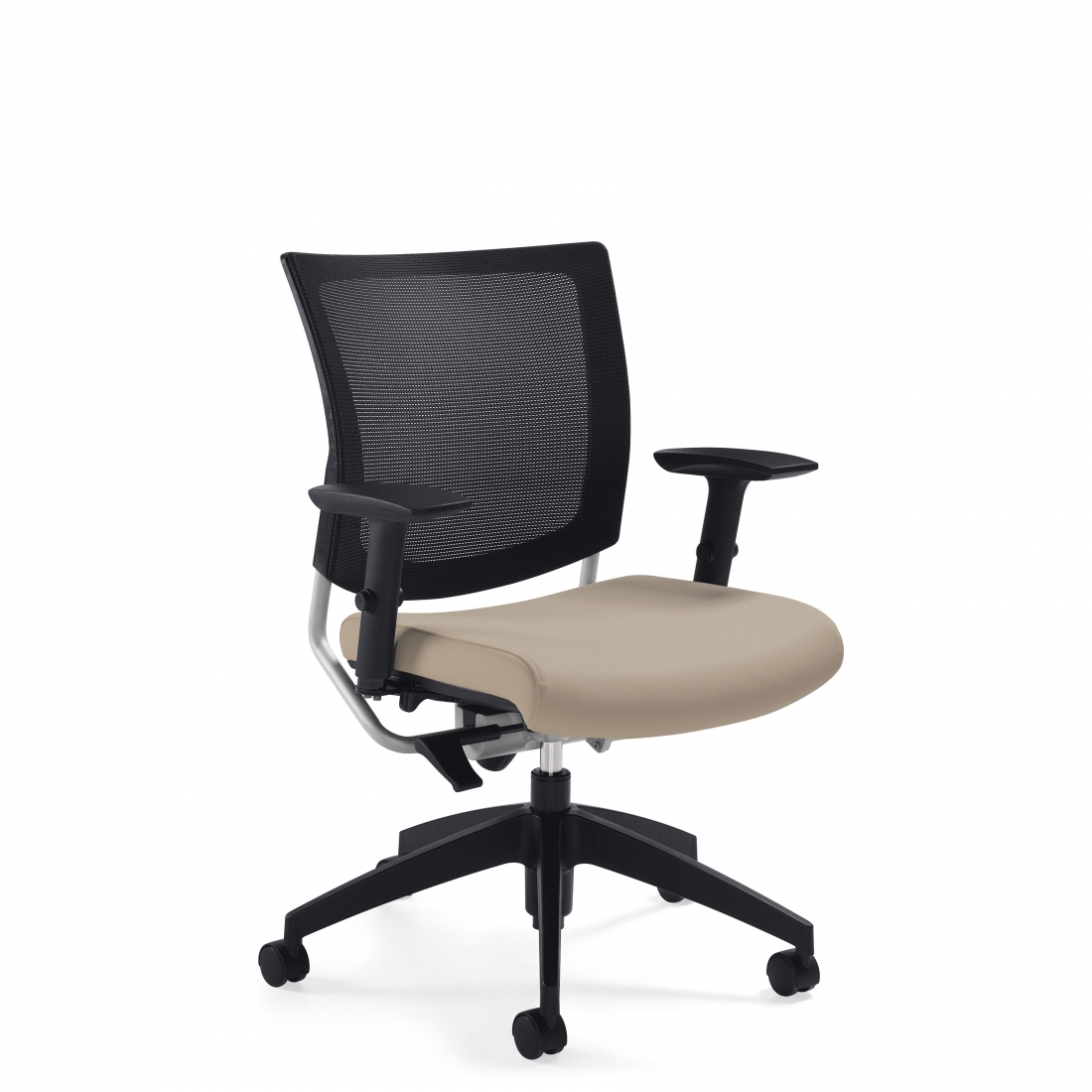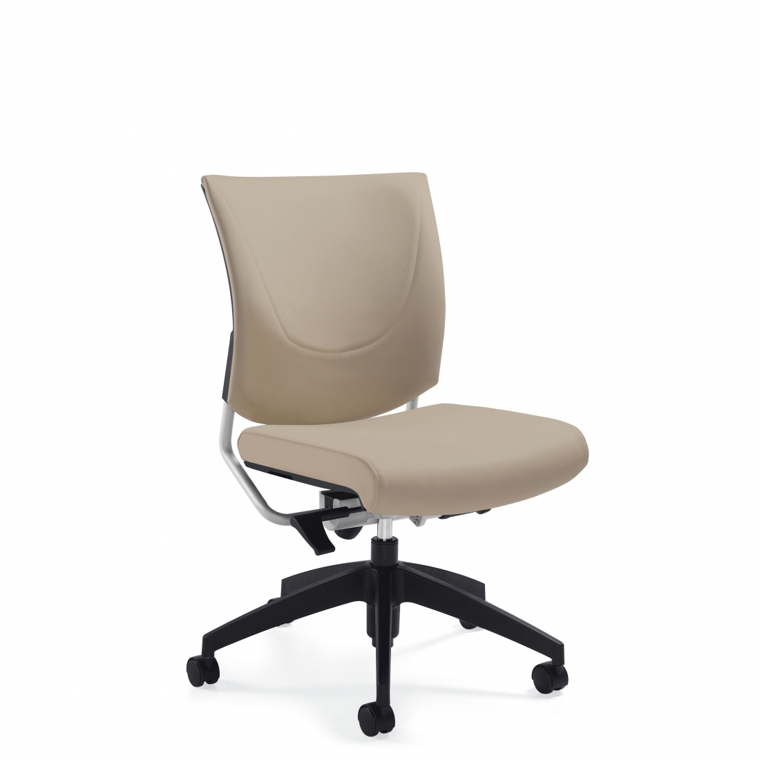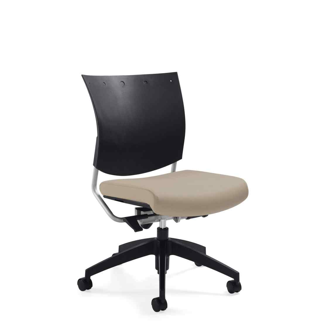 The Graphic is a contemporary task chair series with three distinctive slim profile back styles: a durable nylon shell, a fabric upholstered shell, or a leather upholstered shell. The unique spring balance mechanism, posture-style back is designed to pivot from a point directly below the users hips resulting in a natural motion. The tilt-tension can be adjusted to balance the user's body weight. The back can also be locked in either an upright or reclined position. Arms are height and width adjustable with durable Self-Skinned Urethane (SSU) armcaps that slide forward and back. Available with optional Tungsten base.