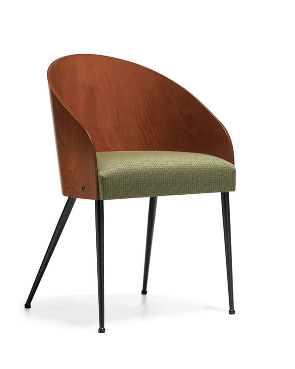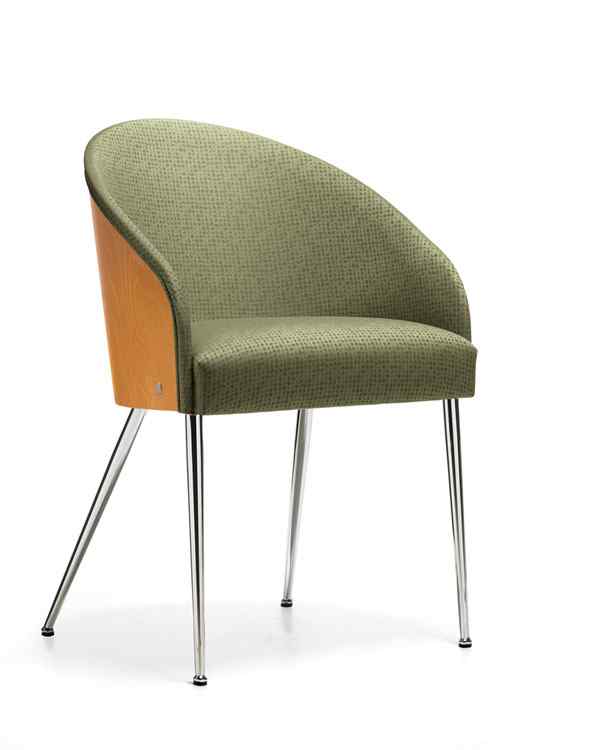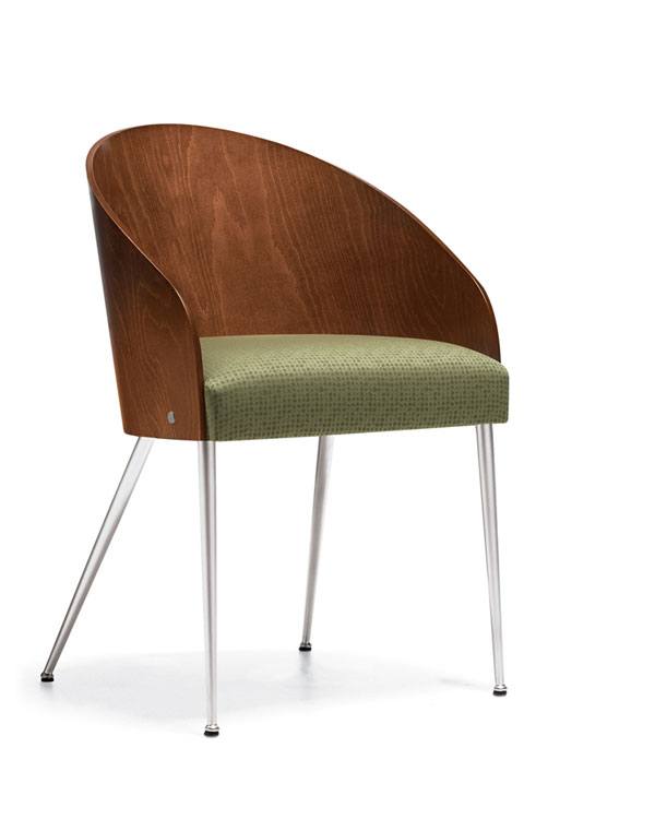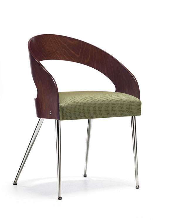 Italian designed curved plywood chairs with Chrome, Black, Tungsten or Brushed Chrome legs and upholstered seat. Wood finishes: Descor standard wood finishes. Frame finish options: Black and Tungsten standard, up-charge for Brushed Chrome and Chome.
