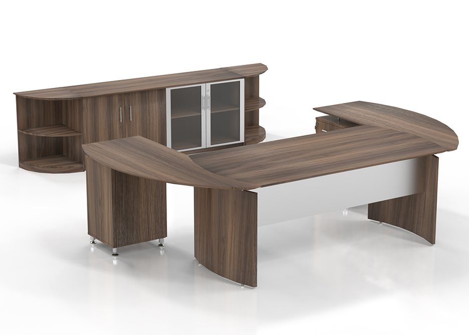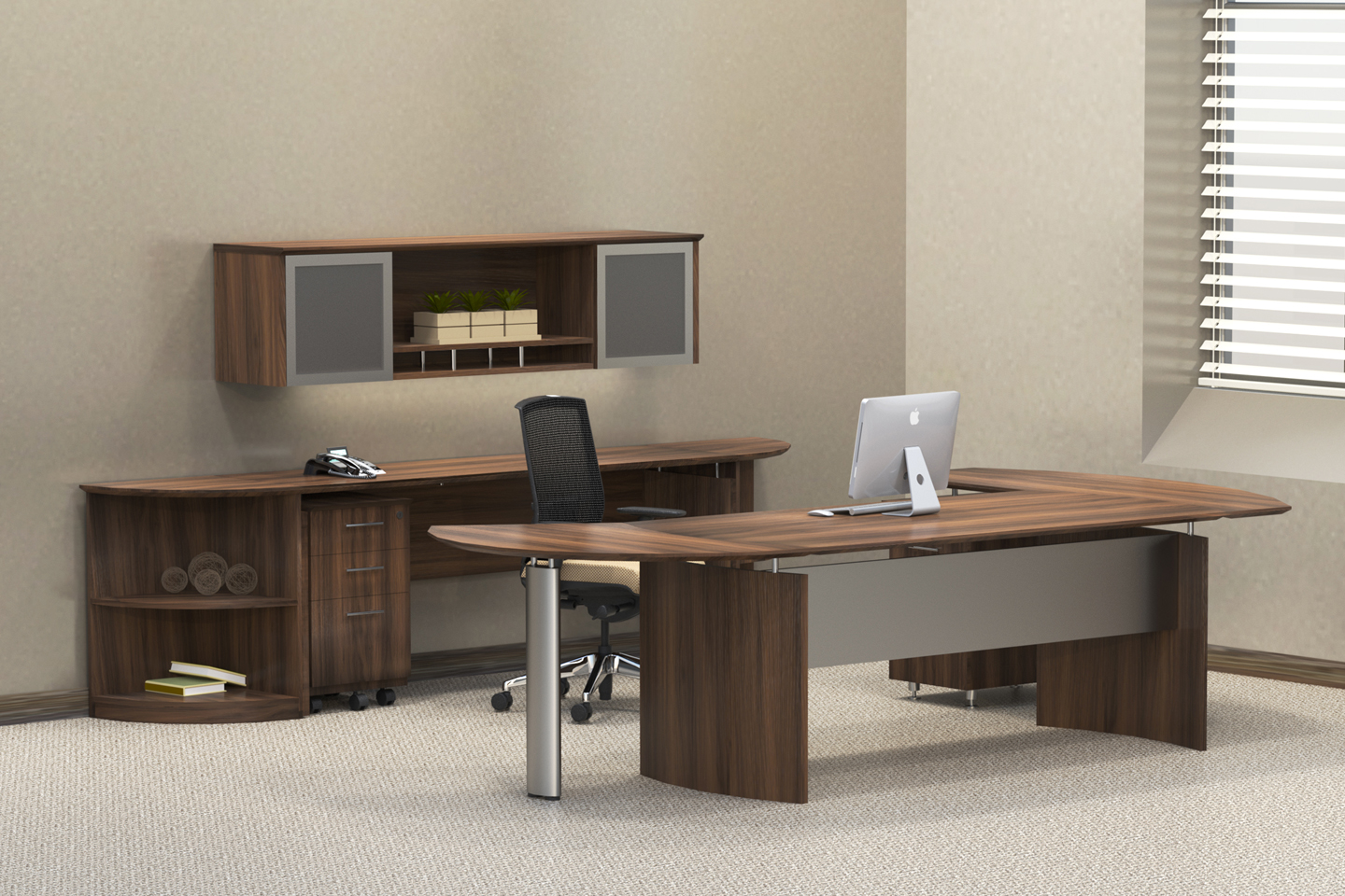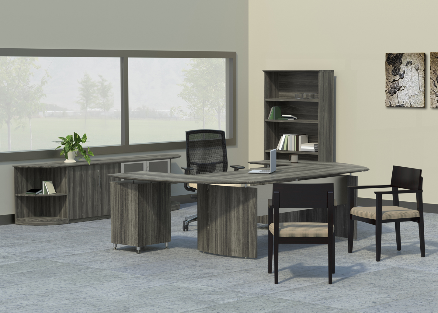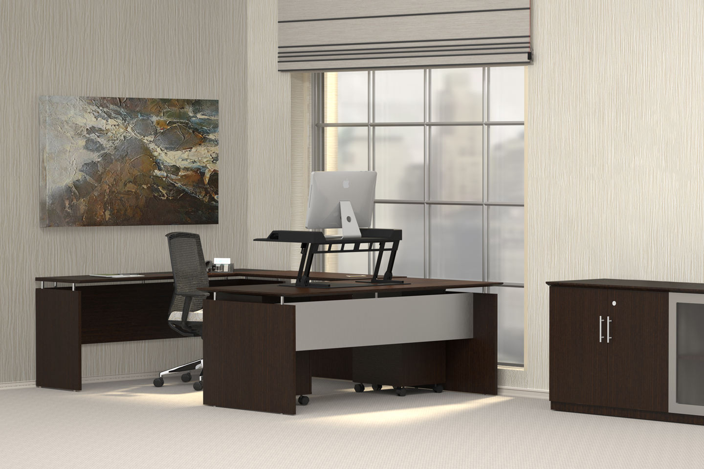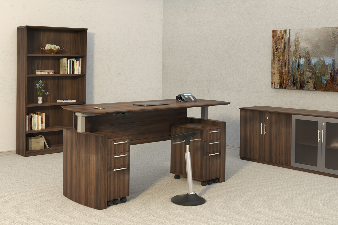 Medina series private office executive suites are available with seated-height or electric height-adjustable sit-to-stand desks. Choose from a variety of desking configurations, with optional height-adjustable bridges to support today’s dynamic and active workspaces. Pair the desks with a variety of storage and filing piece to create a functional and cohesive workspace. Some of the many components in the Medina executive suite series are curved desks, rectangular desks, height-adjustable desks/bridges, curved desk extensions, returns, modesty panel, hutches, credenzas, lateral filing drawers, pedestal, cabinets, bookcases, and more.