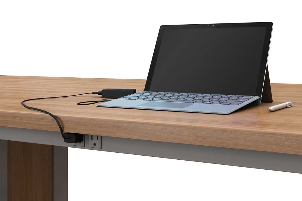 With optional routing holes, power and cables route vertically through the Solano conference table TT-Leg via a hole at the top and bottom. Optional cable grippers or cable managers route power and cables horizontally beneath the table top. Alternatively, removable leg covers can be added, creating a 3/8” channel to conceal and route power and cabling to the floor.