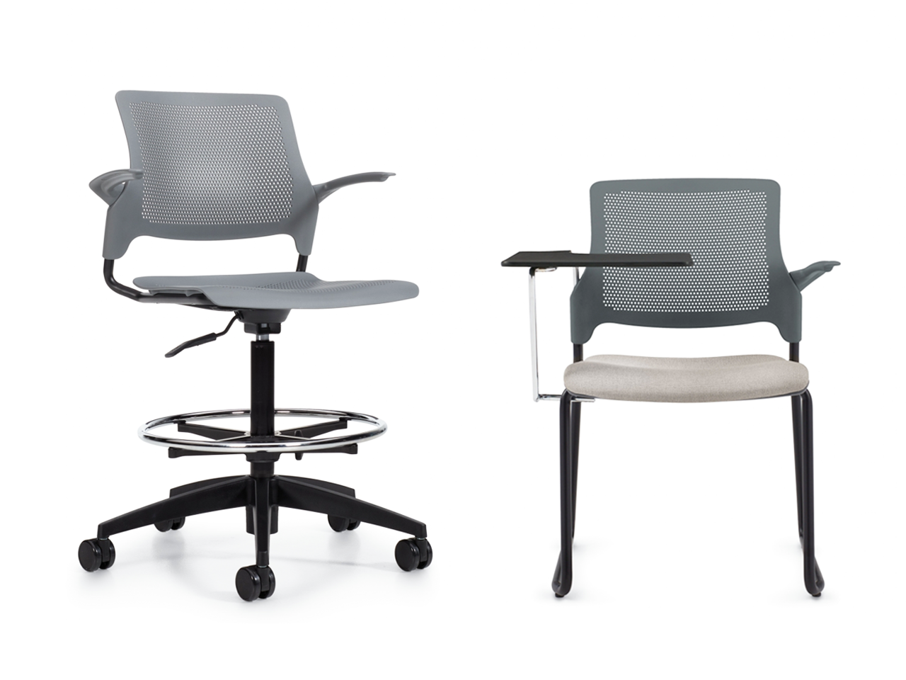 The versatile Stream series includes various models: four-legged chairs, sled-base chairs, tablet chairs, stools, and task seating.
