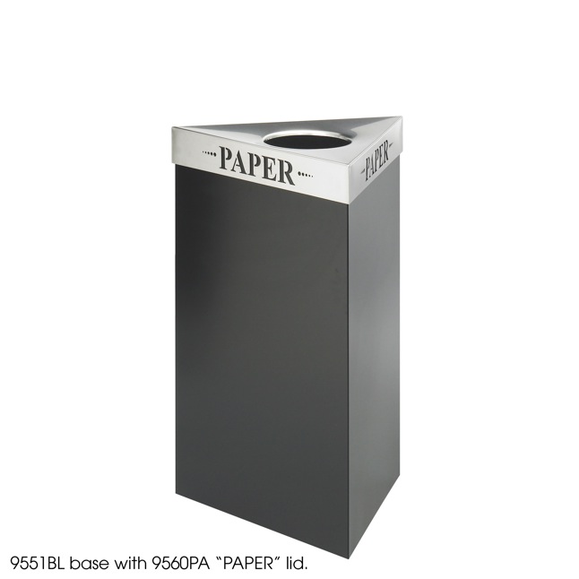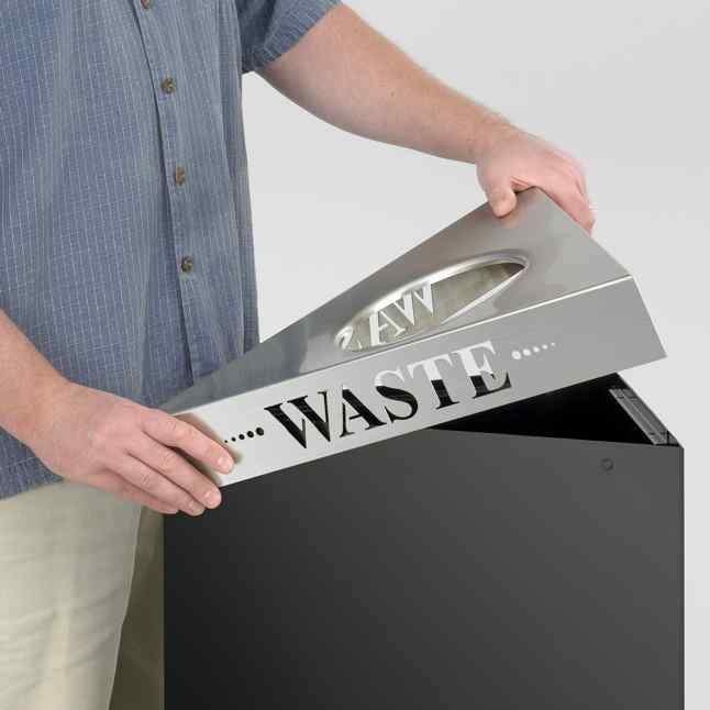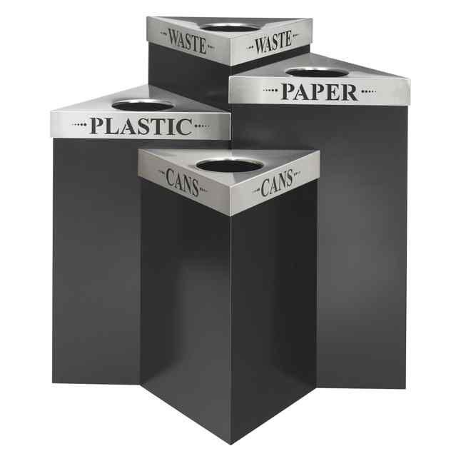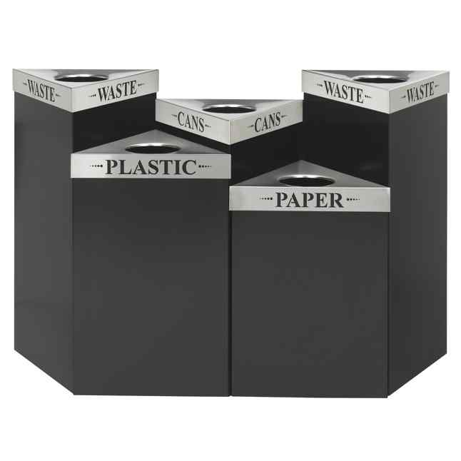 A bin design that allows for endless configurations and can easily be fit into corners. standard lidinscriptions include: waste, paper, cans, recycling, plastic, however, custom inscriptions are available at an upcharge.